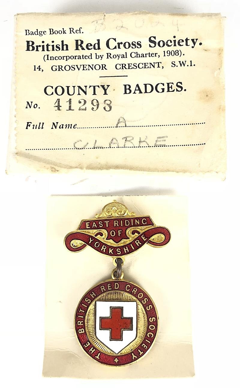 A scarce original early period 'British Red Cross Society County of East Riding of Yorkshire gilt and enamel badge' with box of issue inscribed 'No 41293 A CLARKE' and also to the badge. Excellent condition, complete with original pin fittings, no stress marks or damage to the enamel.Height approx 48mm.The British Red Cross Society County / Branch badge was Instituted in 1911 and Discontinued in 1956.