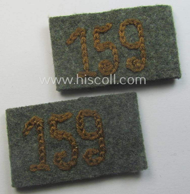 This is an attractive - fully matching and in this branchcolour truly scarcely found! - pair of WH (Heeres) 'Kradschützen'-related, so-called: regimental shoulderstrap-'slip-ons' (ie. 'Schulterstück-Überschuben') as was intended for usage by a: a: 'Soldat des Kradschützenbtl. der Pz.Div. u. Inf.Div. (mot) 159' (or: simple soldier who served within a tank- ie. infantry-related, motor-cycle unit, numbered: '159') and that comes in a wonderful- (and I deem simply never worn- nor used-), condition. The pair is neatly 'machine-stitched'-embroidered (by means of so-called: 'Kurbelstickerei') in the typical copper-brown- (ie. 'kupferbrauner'-) coloured wool and does show some minimal storage-age only. Simply an attractive pair of 'Kradschützen'-related 'Überschuben' that is - I deem - accordingly priced: great to 'decorate' a pair of 'kupferbrauner'-piped 'Heeres'-shoulderstraps or ideally fitted to keep in any insignia-collection!