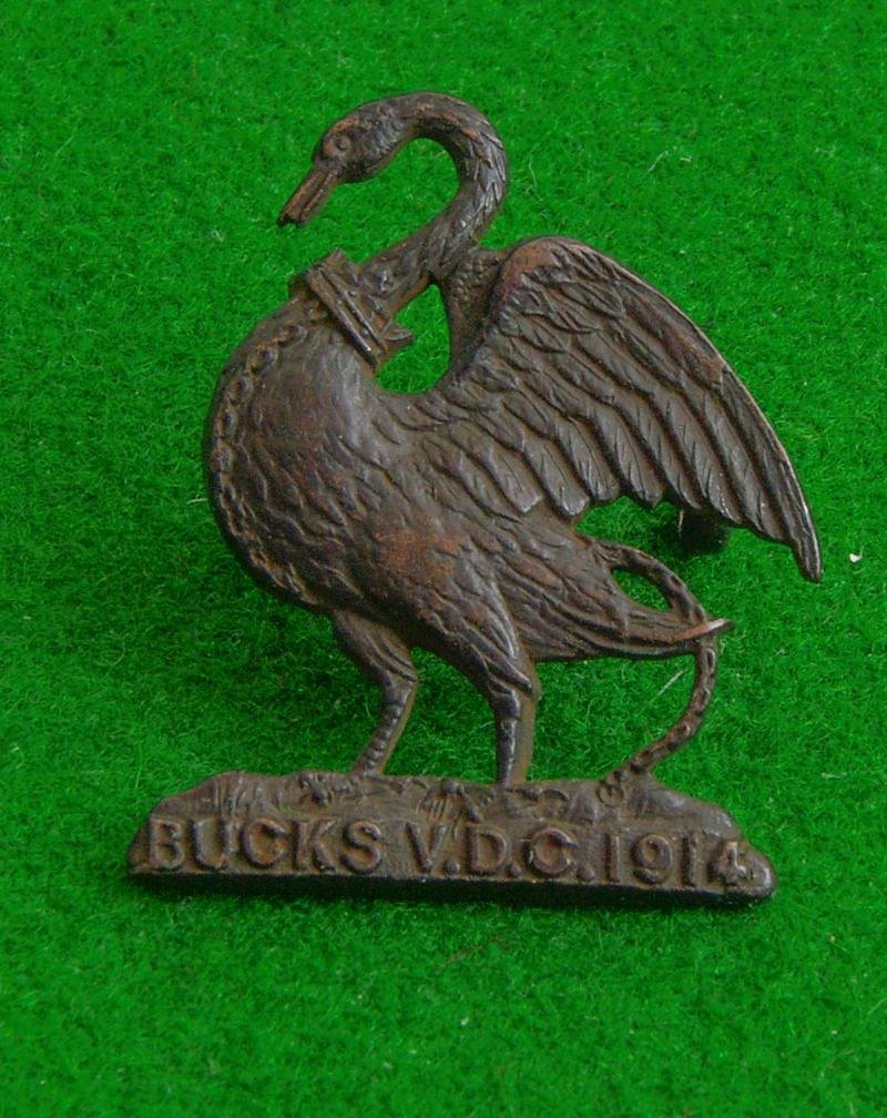 Small bronze cap badge with two loops to the reverse. The Swan from the County Arms standing upon a tablet, ' Bucks V.D.C.1914' Worn in WW I as part of the Volunteer Training Corps.