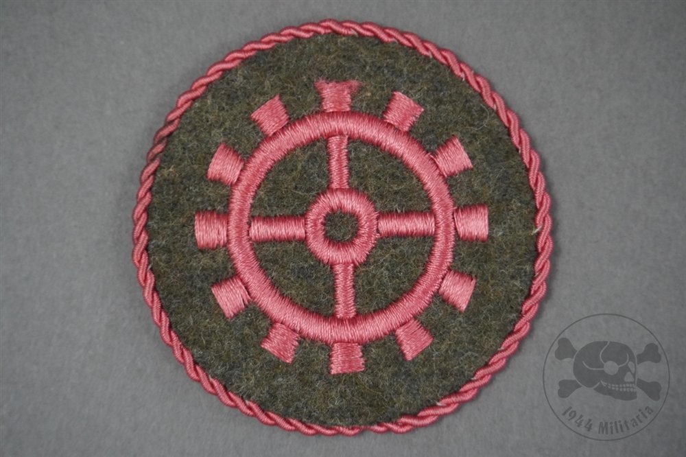 Original German WWII Motor/Panzer Mechanic 1st Class Trade Badge (Kfz- und Panzerwartpersonal I Abzeichen)-During the Third Reich, a wide range of trade and specialist insignia were introduced to denote enlisted men and NCOs who had qualified in a specific trade or function. These badges were typically worn on the lower right sleeve of the field or service tunic by personnel ranging fromSchützetoStabsfeldwebel. Certain trades were restricted to enlisted ranks, while those open to NCOs were often distinguished by silver cord piping. Originally produced on blue-green badge cloth, trade badges shifted to field-grey wool in early 1940 to better match standard uniforms. On June 1, 1943, regulations officially introduced the Motor/Armored Mechanic's Trade Badge in two classes: the 1st Class version with pink cord piping, and the 2nd Class without.This is a textbook example of the 1st Class Motor/Armored Mechanic's Trade Badge. The badge measures approximately 50mm in diameter and is executed on a field-grey wool base. Centered is a machine-embroidered twelve-cog gear wheel with four inner spokes and a central hub, all finely stitched in pink rayon thread. The outer edge is bordered with twisted pink rayon cording, neatly hand-stitched in place—denoting 1st Class qualification. An excellent representation of this increasingly hard-to-find specialist badge.