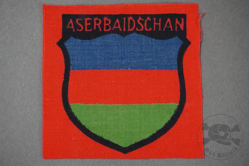 Original German WWII Azerbaijan (Aserbaidschan) Sleeve Shield Foreign Volunteer-Following the launch of Operation Barbarossa on June 22, 1941, German forces encountered various non-ethnic Russian groups—many of whom welcomed the Wehrmacht as liberators from Soviet rule. Despite Hitler's deep mistrust of their ethnic origins and loyalty, frontline commanders recognized the strategic advantage of employing these volunteers, particularly amid increasing manpower shortages. By the summer of 1941, non-ethnic Russian POWs and volunteers were being utilized in labor and logistical support roles, often against Hitler's direct orders.Azerbaijan was of strategic importance during WWII due to its vital oil reserves. The German military's 1942 Operation Edelweiss aimed to seize the oil fields in Baku and cripple Soviet fuel supplies—a campaign that brought increased military and political attention to the region.This is an excellent, unissued example of the German-issued sleeve shield for Azerbaijani volunteers who served in the Wehrmacht. The shield is screen-printed in vivid blue, red, and green over a black field, with a red background. The word 'Aserbaidschan' appears prominently across the top in red block letters.This shield is the standard printed version intended for wear on the upper right sleeve of the uniform. It remains in excellent, unissued condition, retaining vibrant color and crisp detail—a fine example of foreign volunteer insignia from the Eastern Legions.