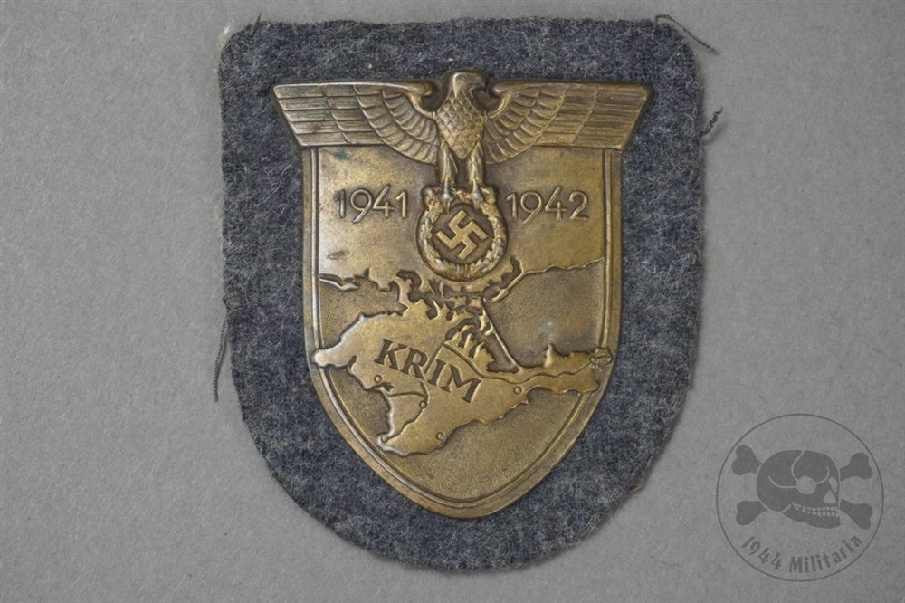 Original German WWII Uniform Removed Luftwaffe Issued Krim Shield-The Krim Shield was a German World War II campaign award presented to Wehrmacht personnel who served on the Crimean Peninsula during the Eastern Front campaign between September 21, 1941, and July 4, 1942. Instituted by Adolf Hitler on July 25, 1942, the award recognized the 'heroic battles' fought during the successful capture of Crimea by Army Group South, primarily the 11th Army under Generalfeldmarschall Erich von Manstein.The design features a German national eagle clutching a swastika, positioned above a map of Crimea flanked by the dates '1941' and '1942' and the word 'Krim.' The shield was worn on the upper left sleeve of the uniform.Eligibility required participation in one of eight designated battles, being wounded in action, or serving at least three uninterrupted months in the region. It was awarded across all branches of the Wehrmacht, including the Heer, Luftwaffe, and Kriegsmarine.Originally made of steel and later zinc, the shield was issued mounted on a backing cloth in the branch color, making it suitable for stitching onto the uniform. An estimated 200,000 to 300,000 Krim Shields were awarded.This original Luftwaffe-issued Krim Shield is a uniform-removed example from an unknown maker. Crafted from magnetic steel, the shield displays excellent detail with only minimal signs of period wear.It is mounted on Luftwaffe blue wool backing and retains its original black paper backing, which shows a small hole and signs of removal stitching, indicating it was once affixed to a uniform. The piece is secured with dark gray thread, typical of Luftwaffe issue.Overall, this is a very well-preserved example in very good to excellent condition, a fine addition to any collection of Luftwaffe or Eastern Front awards.