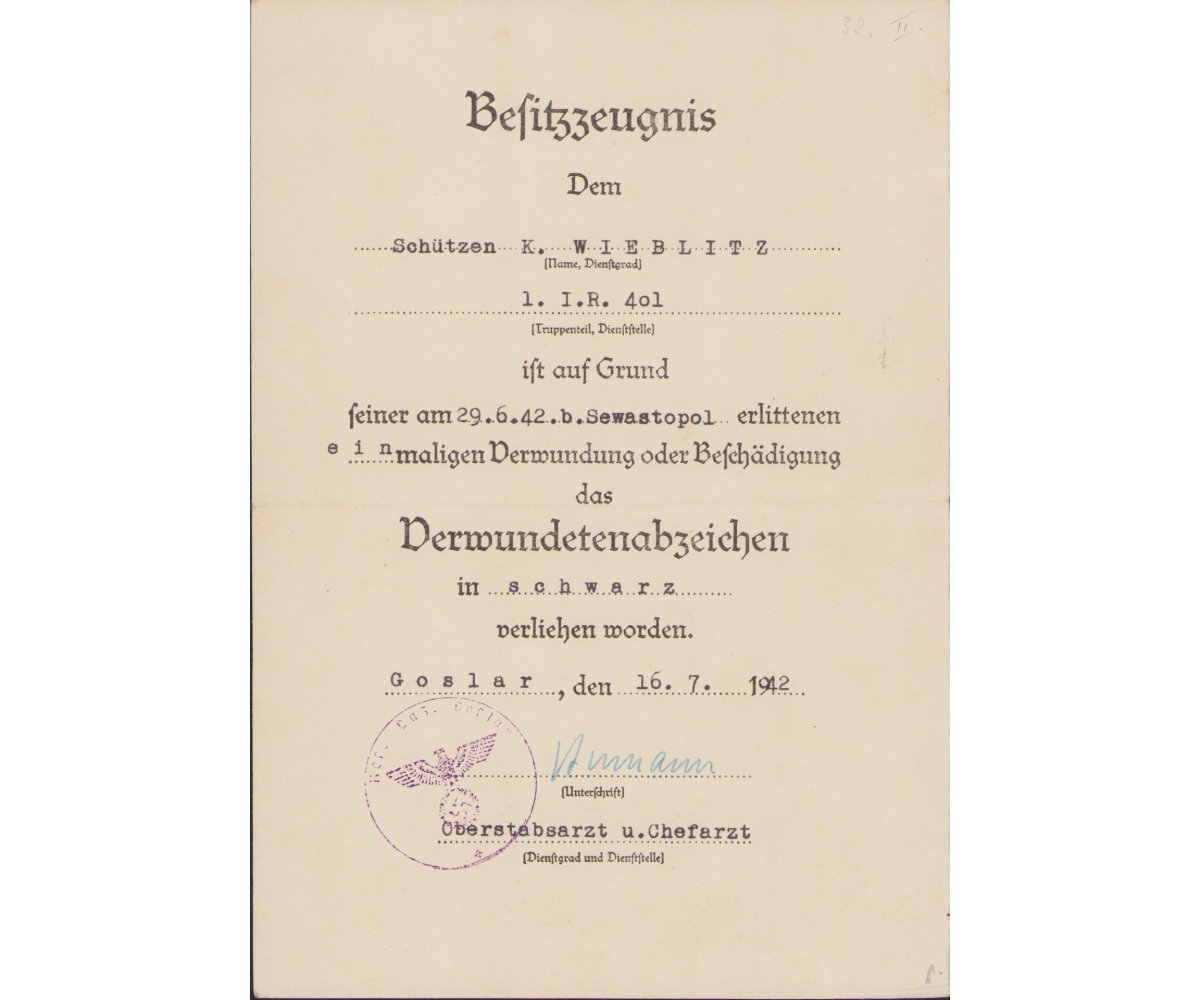 Very nice Verwundetenabzeichen in Schwarz award document in used, but very good condition.