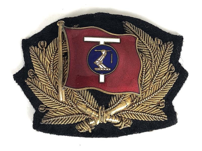 A rare original 'Joseph L.Thompson & Sons Ltd officers shipping line cap badge'; small gold bullion laurel wreath mounted with a fine quality gilt and red enamel flag, displaying a large wihite 'T' with blue enamel disc depicting an arm embowed in armour on torse and holding an arrow, the reverse with early feature blackherringbone lining. Very good condition, a superb example.Height approx 46mm.Joseph L.Thompson & Sons Ltd Shipbuilder River Wear, Sunderland England, was involved in the first design of the Liberty Ships.