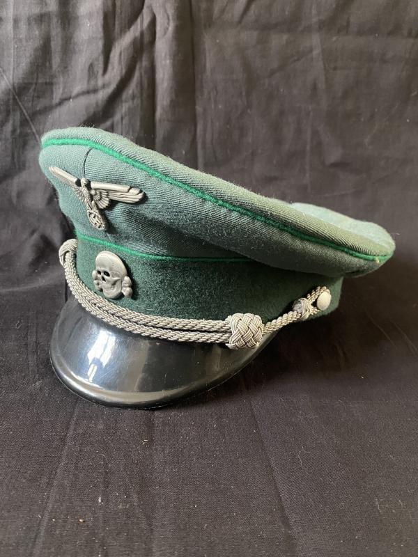 This is a nice post war German Officer's Visor cap which has been converted into a WW2 German SS Officer's Visor cap with the Eagle and Skull added, this one is a size 56 and with nice green piping around the edges.