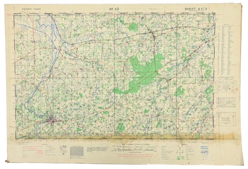 In a very good condition a stunning US WW2 Roadmap entitled 'St Lo', France, 1:50,000 scale, Sheet 6F/2, 1943.The map shows the area north, east and north-east of St Lo.The map is printed in May 1944 and is the 3rd Revision as used during the Normandy Campaign.The map comes in a size of 56x77cm and is preserved on a hardboard plate.The map has traces of use and has also pencil marks original on it!A very stunning mapcard as used during the battle of St. Lo.
