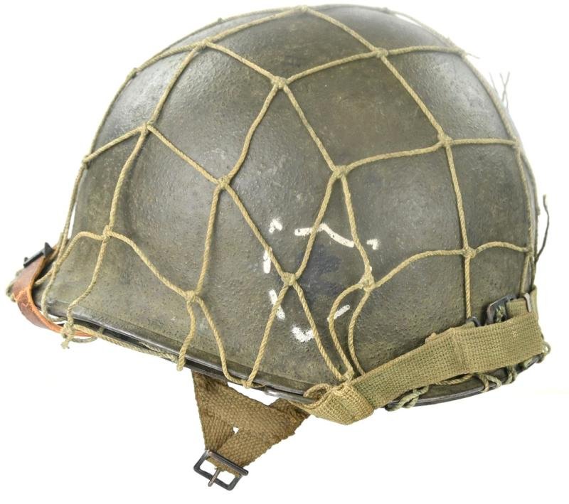 In a very good condition an occupation period Ww2 82nd Airborne Division 325th GIR Decal Helmet.The helmet shell is a late war Swivel bale rear seam helmet with the original chinstraps attached and with productionnumber 1191A (double stamped) on the insde marked.The mc Cord helmet shell comes in the orginal paint and has the 325th Glider Infantry Regiment Decals on both sides original attached!The 325th GIR was part of the 82nd Airborne Division during WW2.The helmet shell has on the inside a inland paratrooper liner attached with the A-yokes still present, United Carr leather chinstrap and original attached.The liner is also named and with ASN on the inside marked.Also a nice width mess helmet net is present as found.A very nice late 1945 paratrooper helmet of the 32th GIR!