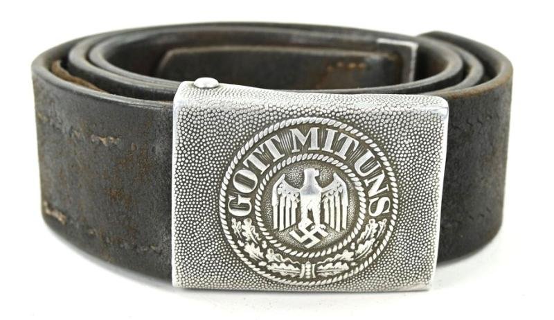 In a very good condition a German Wehrmacht Belt & Beltbuckle.The beltbuckle comes in Aluminium and has still the original leather tab attached.Nicely maker marked (hard to read) and dated 1937.Attached is a very nice used belt with a length of 95cm and matches the beltbuckle.The belt is maker marked and dated 1916(!) and comes with the Reichswehr/Wehrmacht Unit marking of the 2.Kompanie Infantry Regiment 69.A very nice set as found in a private household in the US and is since the war a matching set!