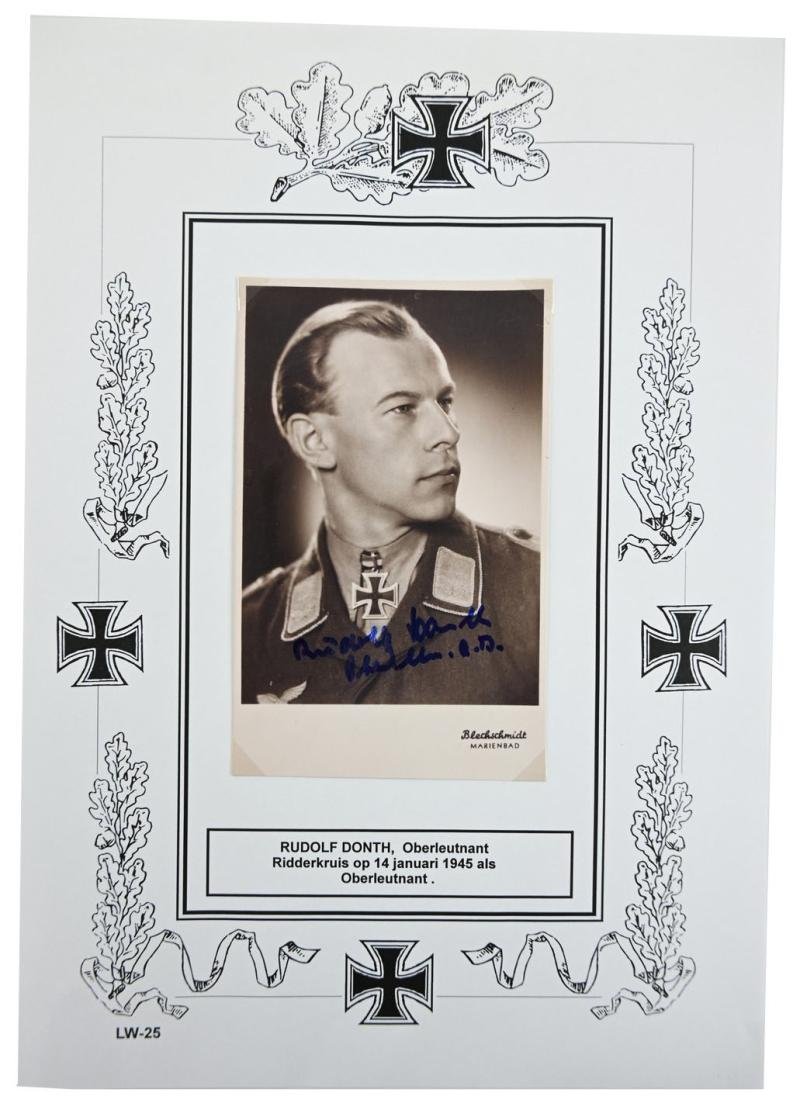 In a very good condition a original signature on a postwar portrait picture of Rudolf Donth.Feldwebel Rudolf Donth earned the German Cross in Gold on June 14, 1944 as Oberjäger in the 6. Kompanie/ Fallschirmjäger-Regiment 4 and the Knight's Cross of the Iron Cross on January 14, 1945 as Feldwebel und Führer of the 6. Kompanie/ Fallschirmjäger-Regiment 4 of the 1. Fallschirmjäger-Division.