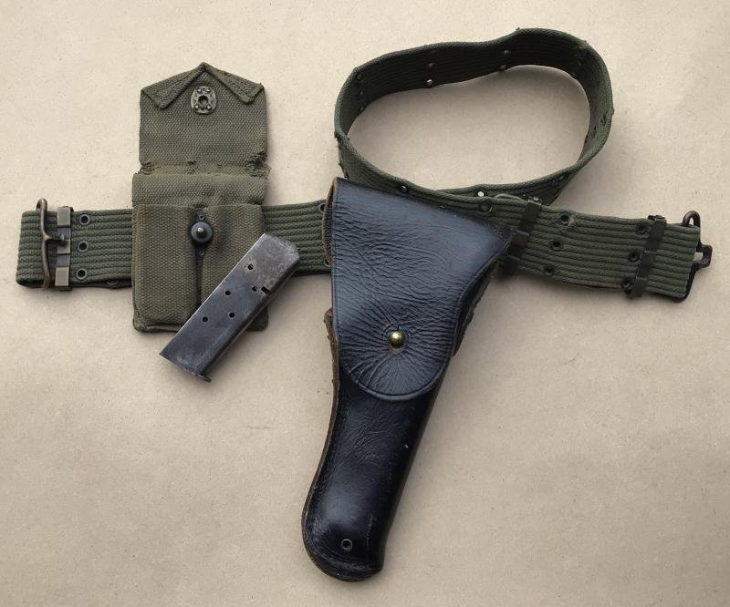 Australian made and issued pattern 1956 web belt with a US made and issued black leather holster for the M1911 Auto pistol in VGC with manufacturer stamp on the reverse and stamped 'US' on the front flap, green web US magazine pouch ( this well worn) and one original US Colt M1911 magazine.Perfect addition to your Australian Vietnam War uniform display.