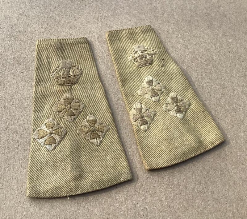 A rare well worn matching pair. Embroidered on khaki cotton drill. Rank of Brigadier as worn in the Mediterranean and the Pacific theaters of war.