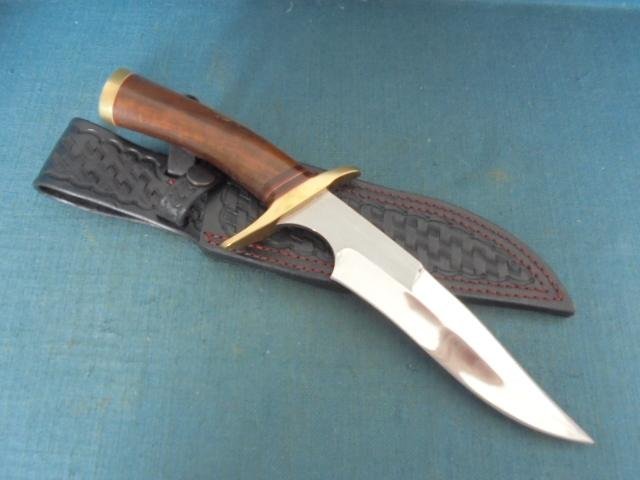 This is a quality knife by Wayne. I don't know the names of his knives, but this looks like a fighter with a 7' blade stamped POTTER and it is 11.75' overallThe knife has an S-shaped brass crossguard pommel and a hardwood grip with an escutcheon plate on the top, and the knife comes with an outstanding quality made sheath S/n 03022Price includes UK delivery