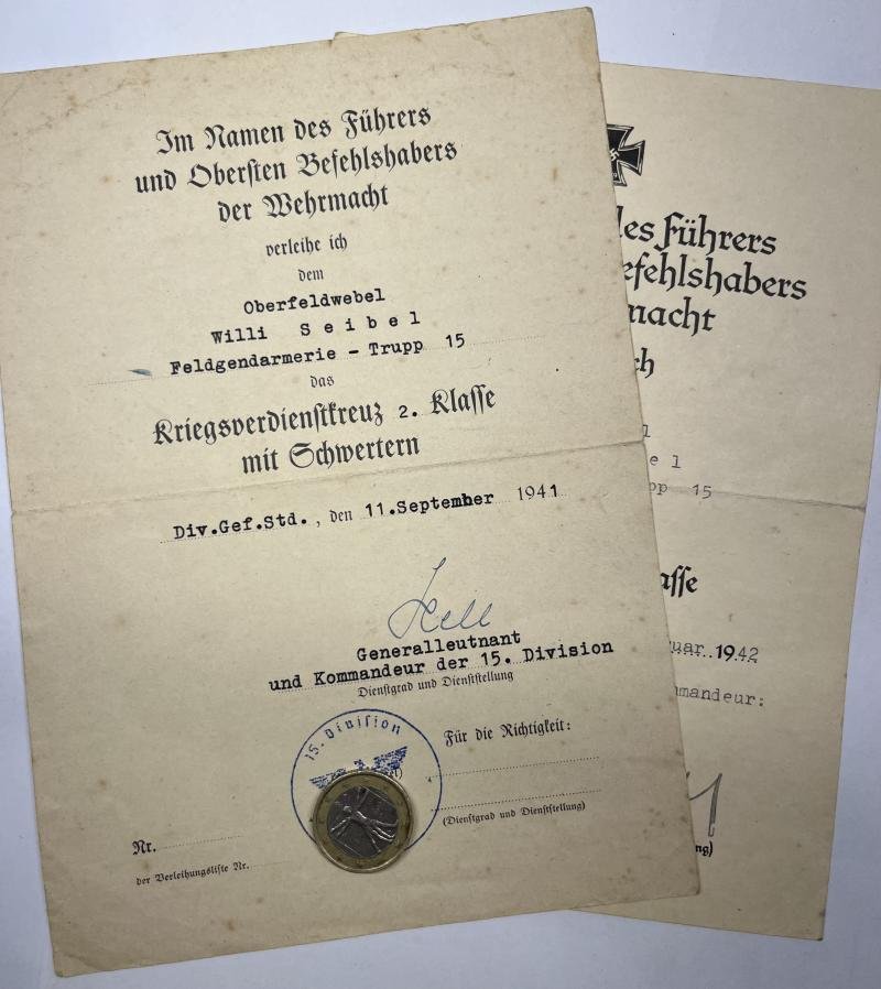 Citation set of 'Oberfeldwebel' Willi Seibel who served within Feldgendarmerie-Trupp 15 of the 15.(Inf.) Div.1) KvK II m.Schw.citation which has been issued by the divisional command post and which has been signed by 'Generalleutnant' and divisional commander Ernst-Eberhard Hell (DKiG 14-6-1942,RK 1-2-1943 ,EL 4-6-1944)!!!Hell was taken POW in 1944 and returned home not before 1955!2) EK II citation which has been issued by the divisional command post and which has been signed by Bronislaw Pawel (DKiG 20-2-1942)Pawel was taken POW in 1945 and hanged by the russians on 3-2-1946.Interesting set !!