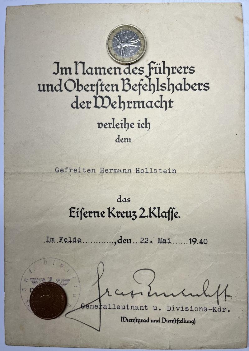 EK II citation of 'Gefreiten' Hermann Hollstein who served under command of the 23.Inf.Div.The citation which has been issued 'Im Felde' has been handsigned !! by 'Generalleutnant' and divisional commander Graf Brockdorff-Ahlefeldt (RK 15-6-1941 ,EL 27-6-1942)Graf Brockdorff-Ahlefeldt died on 9-5-1943As Graf Brockdorff-Ahlefeldt showed great braveness and leadership during the fightings at Demjansk cauldron ,his name (facsimile) was still used after his death to sign the Demjansk citation to honor him!