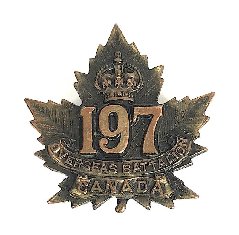 A good original First World War period 'Canadian CEF 197th Scandinavian Overseas Battalion pickled copper other ranks collar badge' the reverse impressed with maker's details 'R.J. Inglis Limited'. Very good condition, complete with original two loop fittings.Height approx 30mm.