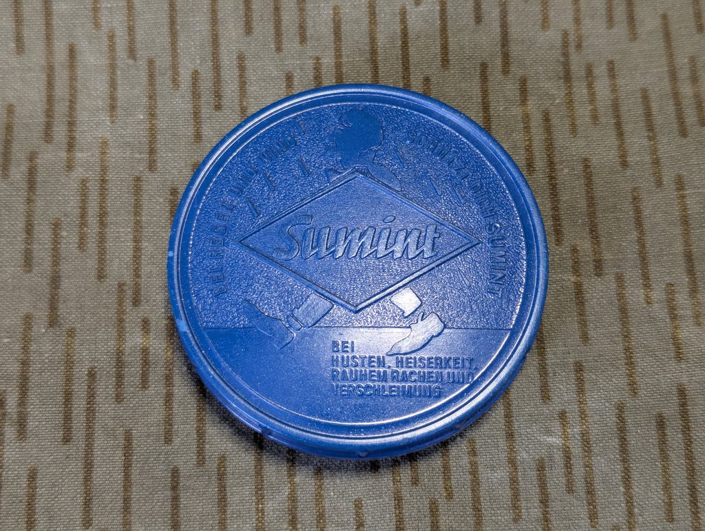 East German Sumint blue plastic cough drop container. Made by VEB Pharmazeutisches Werk Halle. Good condition with light wear.More East German items here.