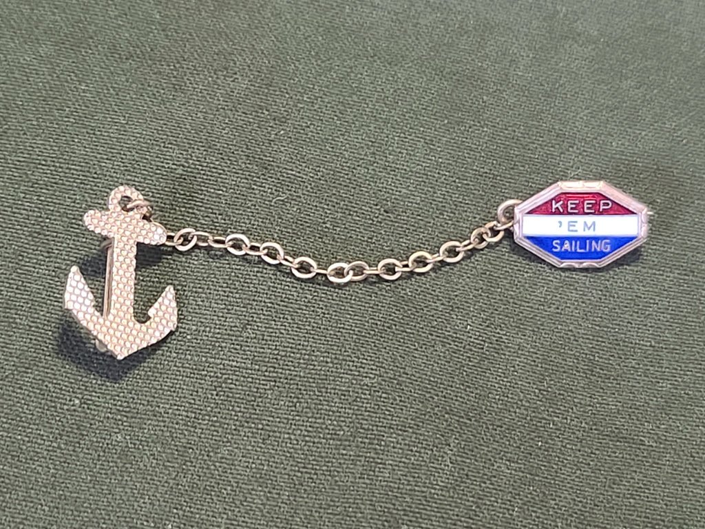 Vintage 'Keep 'Em Sailing anchor small chain pin. The anchor has some very light discoloration. Unmarked. Overall good condition.