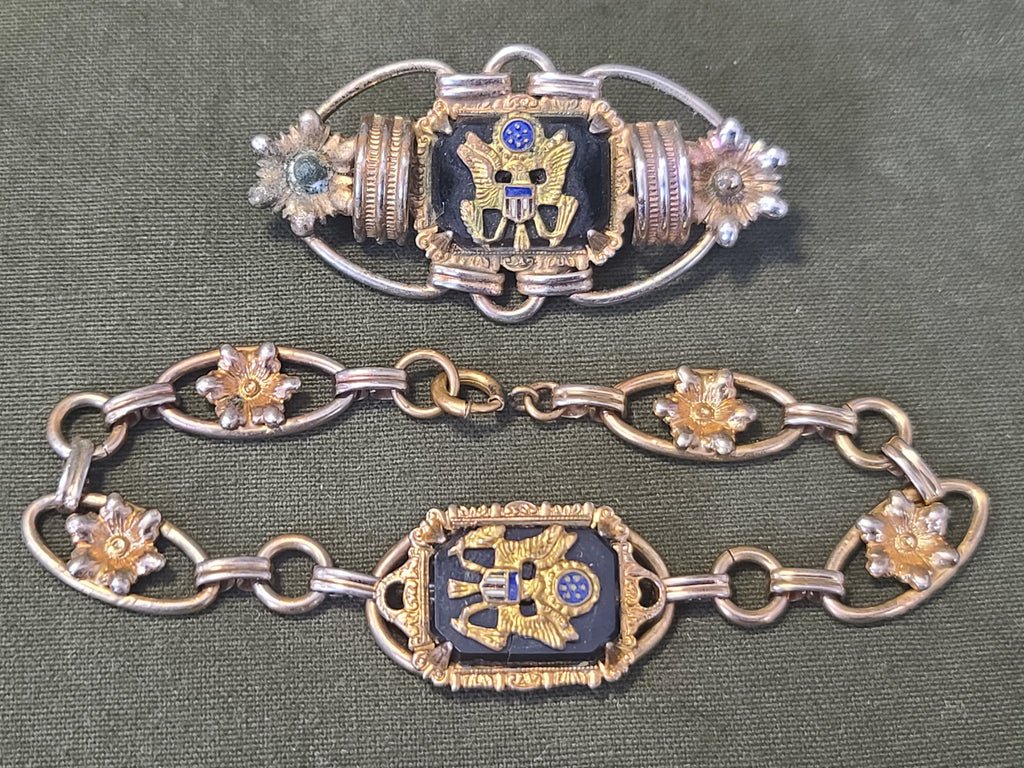 Vintage US Army eagle sweetheart bracelet and pin set. Both pieces have a nice flower design. The eagle looks to be on a black glass piece. Decent, wearable condition. There is a crack on the black piece on the bracelet and it has been stabilized with glue(?) on the back. The crack is not too noticeable on the front. Both pieces have some wear to the finish. One of the flowers on the brooch has a green tarnishing.