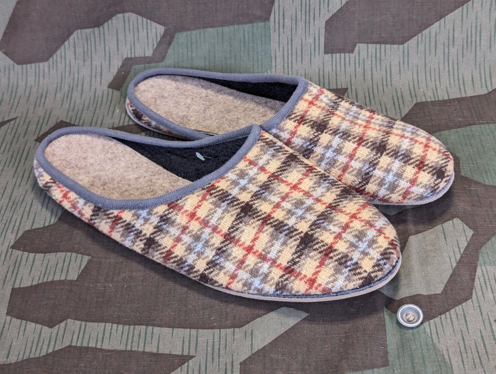 Classic German hausschuhe (house shoes) or slippers. The company that made these for us was founded in 1942 and this is their original pattern of house shoe. The cut, the sole and the pattern are the same as they were in 1942. The only differences are the glue used on the sole and the general fabric content which now has more synthetic fibers.The soles are made of a sort of dense foam rubber material, which is actually correct for the era.These were made without the modern tags and labels to make them closer to what they would have been in 1942 and they were able to find the original size ink stamps their grandfather used to mark the soles rather than a modern tag (unfortunately the size 46 does not have this stamp as that one wasn't present). The size 46 also has a black inside fabric whereas the others have a tan color. The company appreciated that we took an interest in their history and they had some fun embracing their origins to produce these.The newer materials will make these rather more durable.Sizes are listed as EU sizes and as US men's shoe sizes.These do run a little on the small side.If you are between sizes, it is recommended that you size up. According to the maker, it is good to size up, because the fabric sole rim is broad compared to models by other manufacturers.Slippers are non-returnable if worn.You do not understand Germans unless you understand house shoes, particularly in a more historical or traditional context. When you enter a house, you take off your shoes and put on slippers. While these are called house shoes, one could just as easily call them Tornisterschuhe as I have seen numerous original pictures of German soldiers wearing their house shoes around the Kaserne and even closer to the front. This style of slipper does date back well into the 1800's, according to my collection of original catalogs, but I think most Germans today would have no idea they go back that far. Truly a timeless classic.