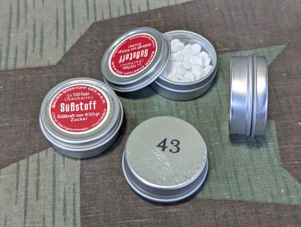 Reproduction small Süßstoff saccharin (artificial sweetener) tin containing about 100 new saccharin tablets. This is based on an original that I found a while ago. Stamped 43 on the bottom. The tin makes it a little more convenient to keep in a pocket or transport in general. The better known versions (usually withblue and yellow graphics) typically came in paper envelopes orsmall cardboard boxesbut having handled hundreds of those, I can tell you that the paper ones leak a lot even when they haven't been bashed around in a pocket. The tin version was the only way to go.This is a trial run with a limited number available. If they do well, I will bring more saccharin back from Germany for a more extensive run. Right now, these are filled with some of my private reserve stock which I bought back for daily use in my morning coffee.NO INTERNATIONAL SHIPPING ON THIS ITEM as it may be seized by customs.