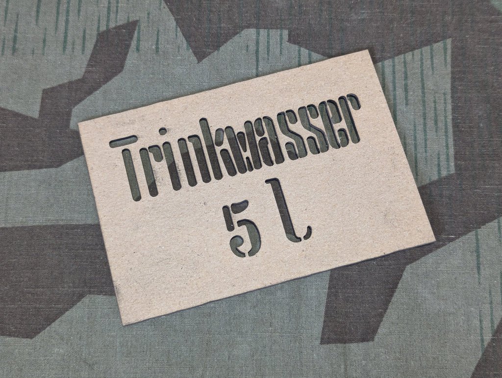 Laser cut cardboard stencil for the 5L trinkwasser can. This type of stencil produces a superior look to the normal vinyl sticker type stencils. This will give you that soft edge over spray that you see on virtually every original. The hard edges made by vinyl stencils has always bugged me a little. Plus, you only need the one to paint all four sides of your can.There is a little charring around the cut edges, but I have not noticed this affecting the paint job and the laser cut cardboard provides a slightly better and cleaner stencil than the 3D printed ones I offered previously. The cardboard stencils are effectively the same and produce the same quality finish.