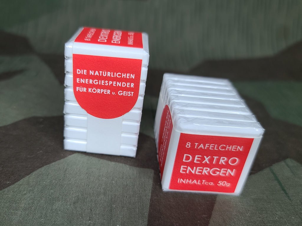 Dextro Energy tablets were originally released in 1935 and rapidly gained popularity. They were the official competition food of the 1936 Olympics. The tablets are documented in several rations books along with similar products. If you like scho-ka-kola, then these are worth a try. They dissolve fairly quickly and have a slight bubble gum flavor.They are brand new in their individual cellophane wrap bound together by a reproduction label based on an original example. The artwork was restored to eliminate flaws. These expire in November 2025.The Luftwaffe rations photos are from the August 31 1943 issue of Der Alder.