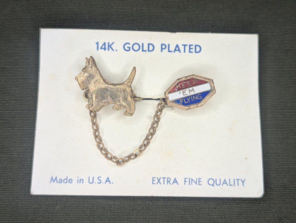 Vintage WWII chain pin on card. One small pin says Keep Em Flying and the other is a scottie dog. Still on its original card in the packaging. The pin does have some storage wear and patina.