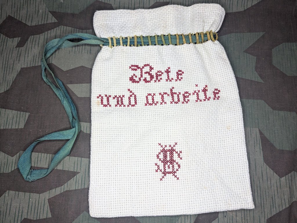 Vintage German handmade bag with Bete und arbeite, (pray and work) stitched on it. It also has a stylized initial S (and H?) which looks like a $ sign, like a money bag. It has a few stains and some fading.