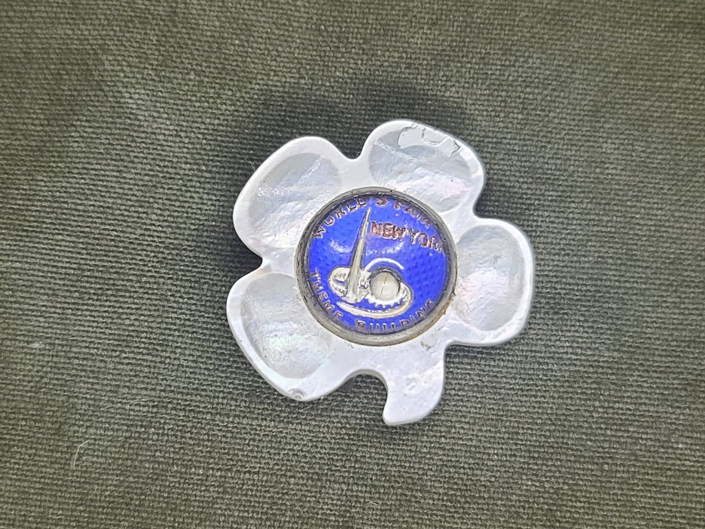 Vintage 1939 New York World's Fair mother-of-pearl clover pin. The convex center piece says 'World's Fair New York Theme Building'. Overall good condition with light wear.