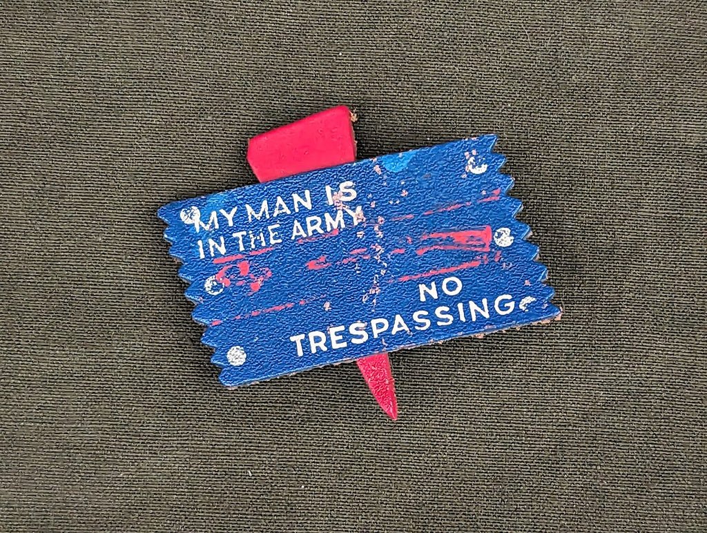 Vintage WWII sweetheart 'My Man is in the Army No Trespassing' sign pin. Made from leather with a early plastic pin on the back. It has some wear. There was a graphic of a rifle in the center, but it is largely worn off.