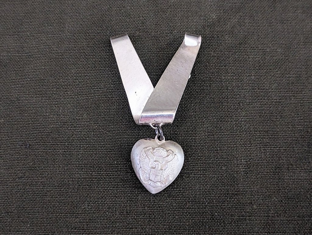 Vintage WWII V for Victory pin with a puffy heart charm of the US army eagle. Nice sweetheart pin. Marked Truart Sterling (the markings are partially covered by the pin). Overall good condition.