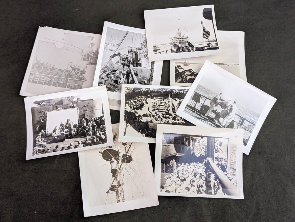 Small lot of 9 photos from a US sailor. Some interesting photos from life on the ship, but unfortunately I do not have any context for them. I do not know which boat or even how old these might be. They came with a lot of wartime items, so I assume they are also wartime. Some minor damage on some corners.