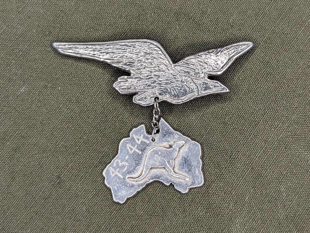 Original handmade sweetheart pin from Australia dated 43-44 to Pauline from Don. Probably made by a GI for his sweetheart back home. Some wear, but fairly good shape overall.
