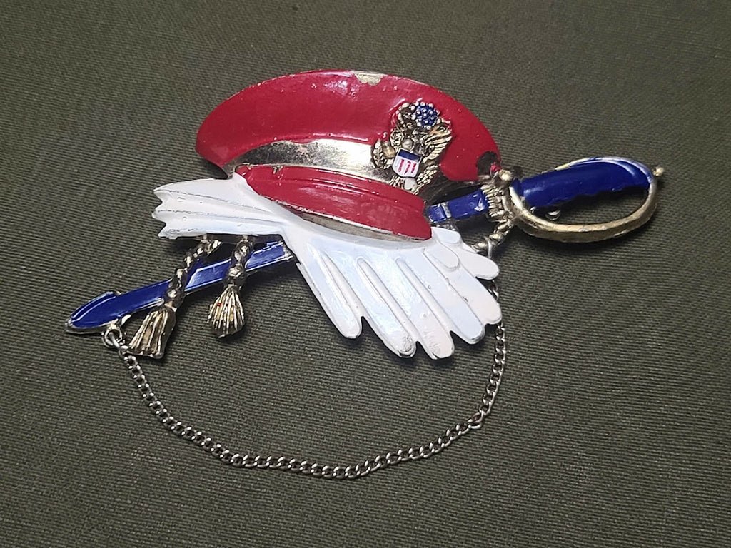 Vintage 1940s army hat with gloves and sword pin. Nice red, white and blue colorful metal brooch. The back is marked LN / 25. Overall good condition with a few small paint chips and light general wear.