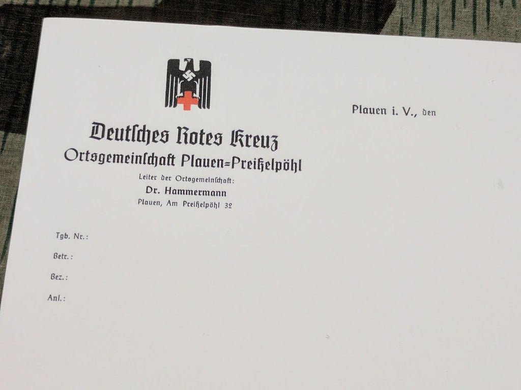 Original DRK (Deutsches Rotes Kreuz - German Red Cross) doctor's stationary from the city of Plauen. New old stock. Except for the the heading, the pages are unused blanks. Next time you can't make it to an event, you can create your own doctor's excuse!The price is for one page.They are slightly taller than standard paper, measuring about 11 5/8' tall by 8 1/2' wide. A few pages might have some small dark specks.All are in pretty good condition. We may have to roll it up to keep it safe for shipping.