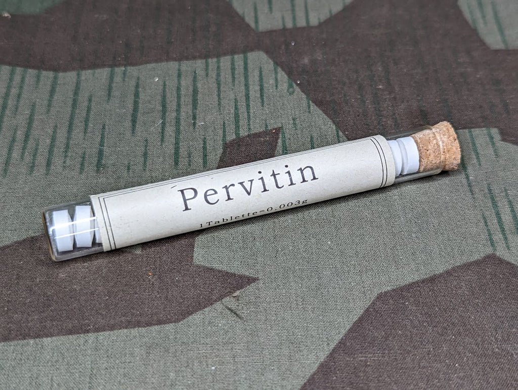 Reproduction glass Pervitin tube filled with brand new 200mg caffeine pills. The pills are similarly strong to the caffeine pills you can buy at gas stations or supplement stores. Themaximumsafe dosage for a healthy adult is 2 pills perDAY.It recommends only using one per day.Warning:Do not exceed the maximum dosage as it can lead to serious injury or death. Do not mix with other caffeinated substances. Not intended for use by persons under the age of 18. Keep out of reach of children.No international shipping on this item.US sales only.