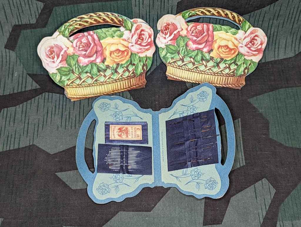 Vintage needle pack in the shape of a flower basket. The needles are rusty and it shows some wear. The paper pack is in English but the paper itself is marked 'Wezel & Naumann A.G. Leipzig M 302'.Price is for one.ADD 3 OR MORE TO CART AND SAVE 15%Discount applied automatically at checkout. Add 3 of ANY items fromthis collectionto save 15%!