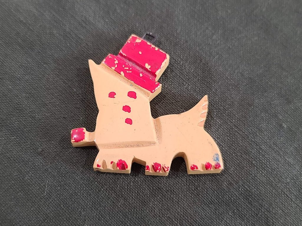 Vintage 1940s bakelite charm of what looks to be a dog in a hat smoking a pipe. Some of the red paint has chipped and there is a blue smudge on the back leg. Some dirt and scratches and the charm loop has wear.