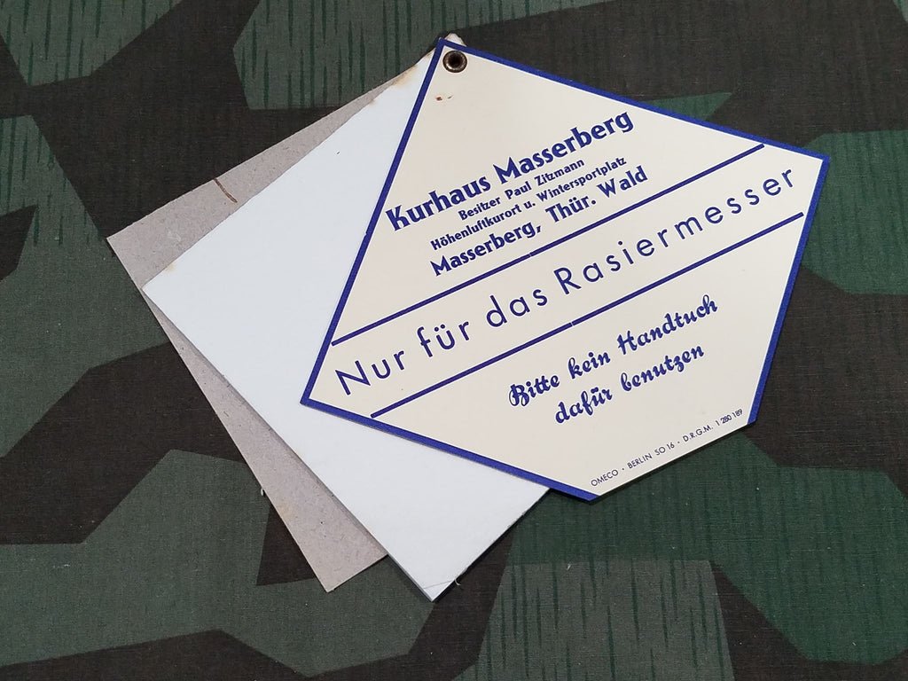 Disposable cleaning towels for straight razors, provided by the hotel Kurhaus Masserberg. Only for the straight razor. Please do not use hand towels - 'Nur für das Rasiermesser - Bitte kein Handtuch dafür benutzen.' It is marked D.R.G.M. (Deutsches Reiches Gebrauchs Musterschutz). The paper label mentions the 1936 Olympics.Price is for one packet.There is a loop on the back to hang it up. It is in good condition for its age, several of the paper towels have some staining / discoloration (mainly along the edges). There is a little rust on the loop. It measures about 5 3/8'.The brochure is from the 1930s (not included, just shown for reference).