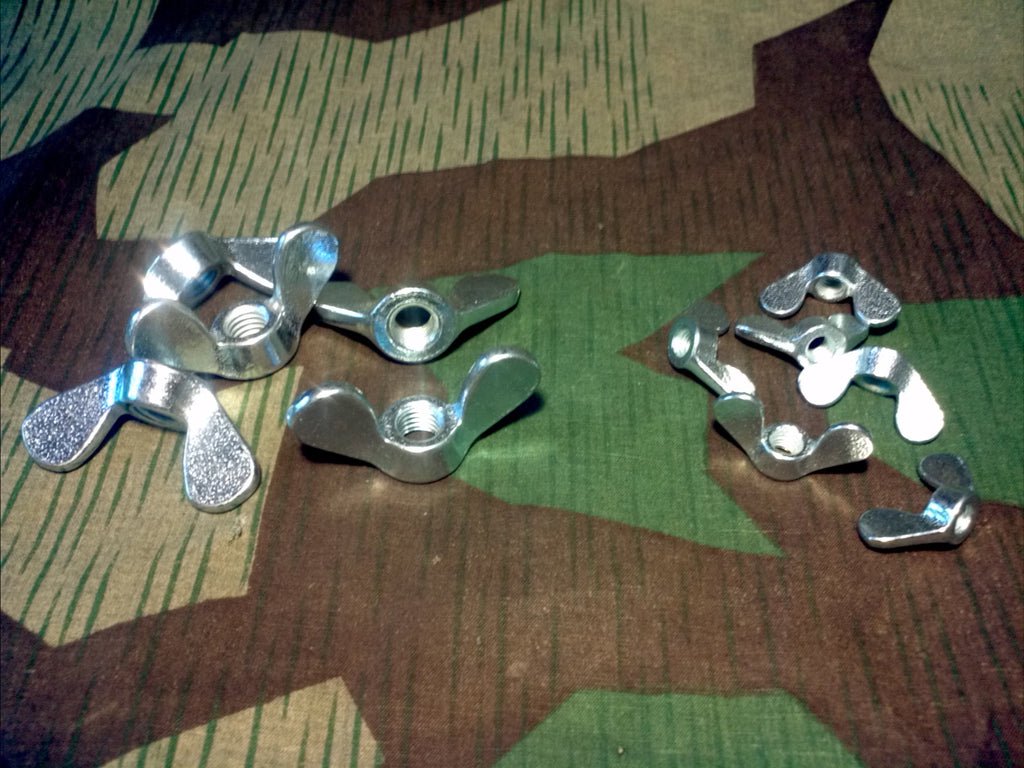 New made German rounded wing nuts, the same type found on various equipment. These are getting harder to find as companies have switched to making them 'U.S. style' with sharp edges.Price is per wing nut.We have two sizes available:M6 1.00 pitchM10 1.50 pitch. (fits Kubelwagen windshield and seat clamp)Choose which size you would like from the drop-down menu before adding to cart.