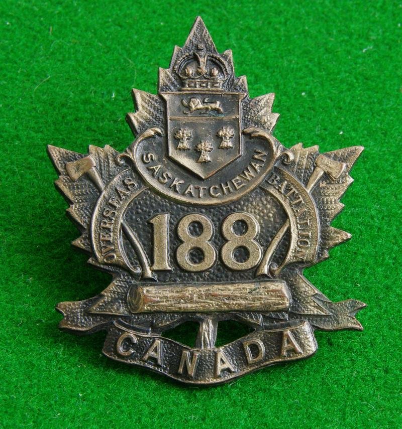 WW I brass cap badge with two loops to the reverse worn by the 188th.{Saskatchewan} Battalion C.E.F. A maple leaf with the scroll, 'Canada' bearing the Coat of Arms and title above the number, '188' and a timber log flanked by a pair of axes and the 'Overseas Battalion ' scrolls.