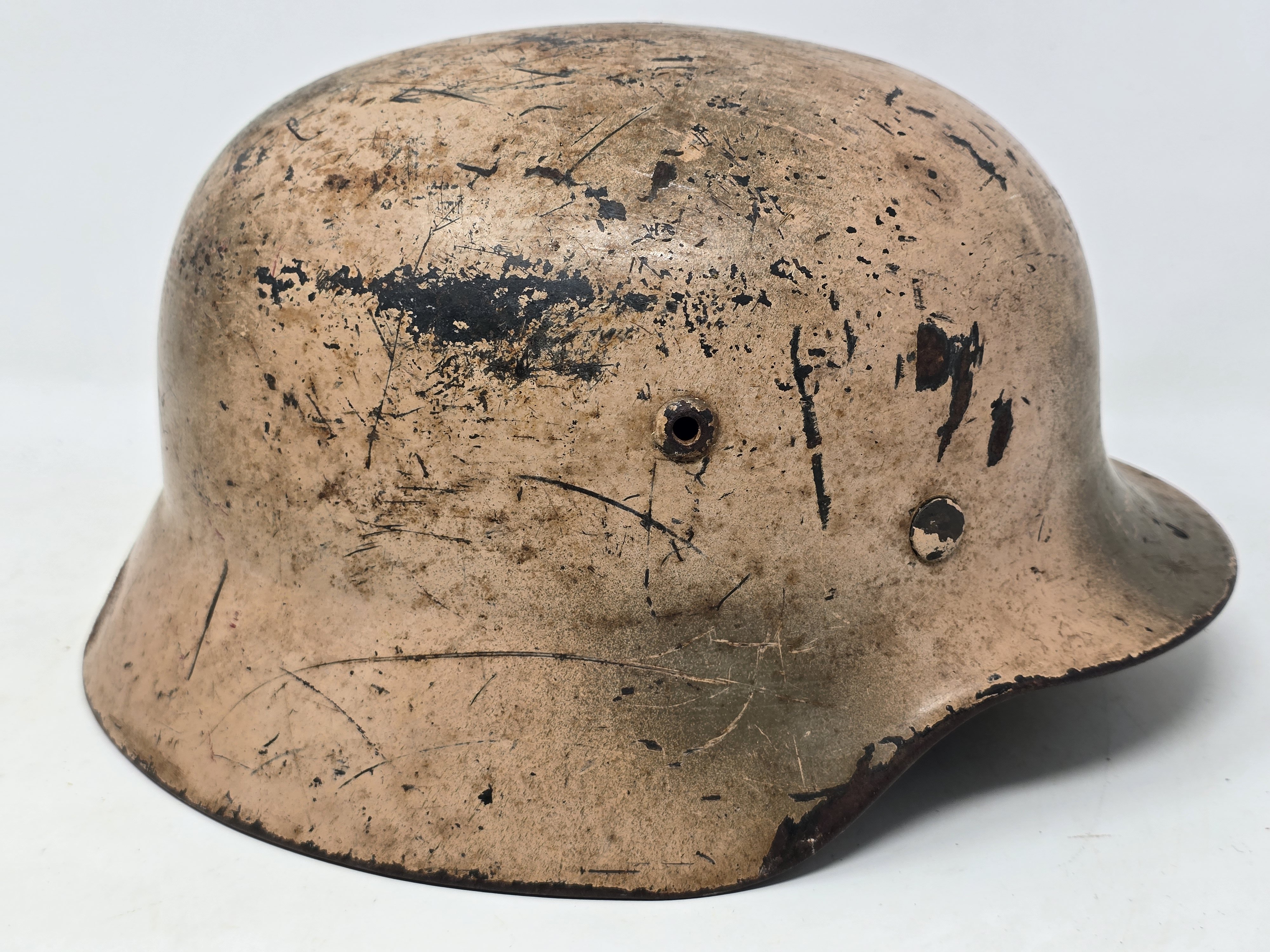 This is a great Q68 M35 Heer, #47?, showing medium service wear and the wearer's name. The liner is dated 1937, with a later dated chinstrap (that happened a lot in the period). The name 'Braünle' is nicely painted in the rear skirt. The helmet is camouflaged in a pink tan base, very characteristic of the Deutsche Afrika Korps. (The pictures slightly fall short of depicting the pinkness, but it is pink). It appears to have been worn in this camo scheme for a period of time, after which some lightly-applied grass green sprays were added to complete the design. This conforms with examples of continued southern front usage, such as Sicily and Italy. The helmet overall is a great example, in size, condition and completeness of remaining camo. Definitely a top shelf helmet. COA accompanies.
