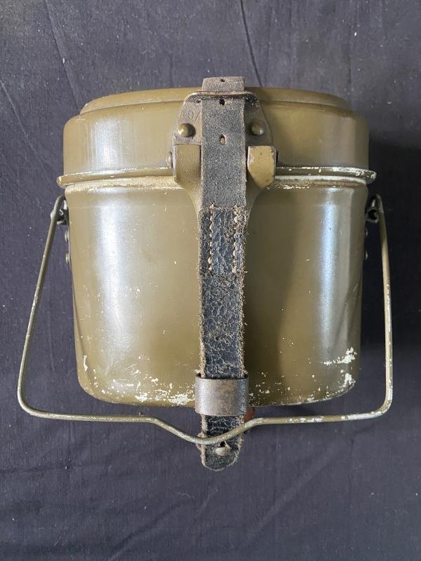 This is a nice WW2 German late War 44 mess tin, has the stamping dated 1944 on both the lid and main body, this one maintains most of its pain and the leather strap is in good condition.