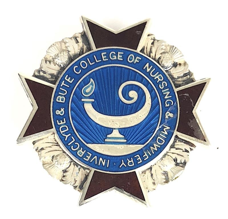 A very scarce original fine quality 'Inverclyde & Bute College of Nursing & Midwifery Scottish hospital badge', the reverse impressed with Birmingham silver hallmarks for 1983, maker's details 'Thomas Fattorini Regent St. Birmingham' and inscribed to the recipient 'J.BROSNAN 1989'. Very good condition, complete with original pin fittings, enamel intact.Height approx 37mm.
