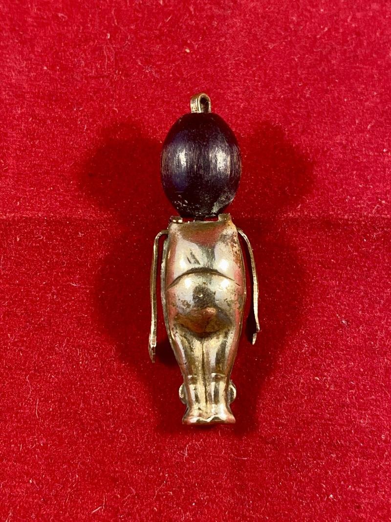 Here on offer is an original WW1 'FUMSUP' or TOUCH WOOD soldiers lucky Gold Plated charm.These charms were given to WW1 soldiers as a 'Good Luck' token that could be carried with them into battle.They come in all sorts of types and this one has a lovely gold plated thin brass body, with moving arms, with detailed fingers and thumbs UP.It is fitted with a wooden head, so the soldier could 'Touch Wood' for luck before a battle.A wire goes through the head allowing it to swivel and is folded into a loop at the top so it can be attached to a chain.The hollow metal brass body is in excellent original condition.The egg shaped wooden head is still a solid piece of wood, with no cracks, but it has lost the painted eyes and nose it would have had originally, through usage.I can imagine a poor soldier rubbing the head for luck before having to endure the horrors of the battles of WW1.The charm measures 1.2' (3cm) long and 0.4' (1cm) wide across the arms.It weighs 1.7g.Please see my pictures for the details of the condition, which complement this description.Please see my TERMS OF BUSINESS regarding Deliver Charges and Insurance regarding additional insurance cover, should you require it, BEFORE the item is dispatched.The responsibility lies with the customer to check with your Customs restrictions that this item can be imported into your country.