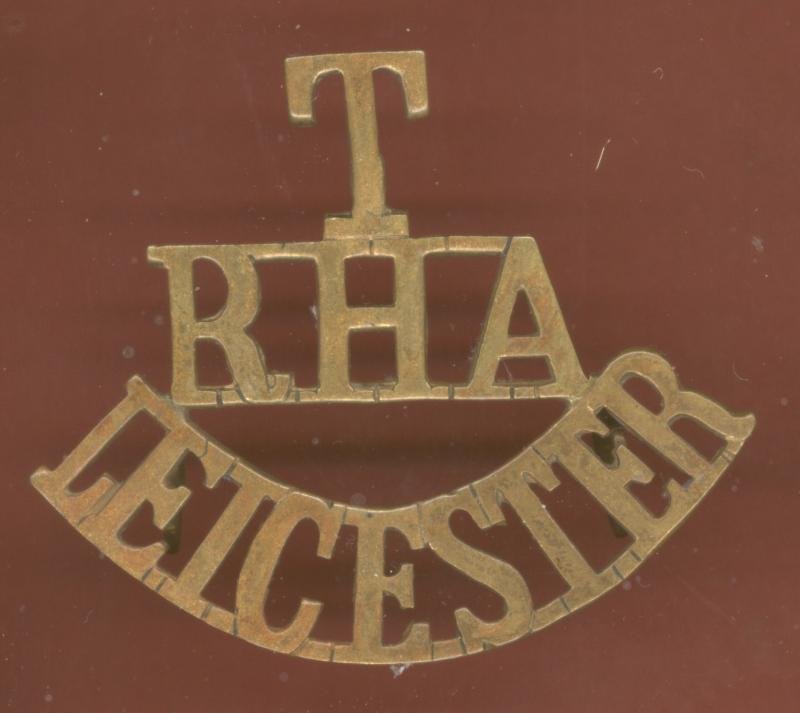 A super scarce Royal Horse Artillery brass shoulder title worn by the Leicestershire Territorial Battery Royal Horse Artillery circa 1908-19. Three hex type lugs to the reverse. VGC. Westlake 591North Midland Mounted Brigade , H.Q. Leicester