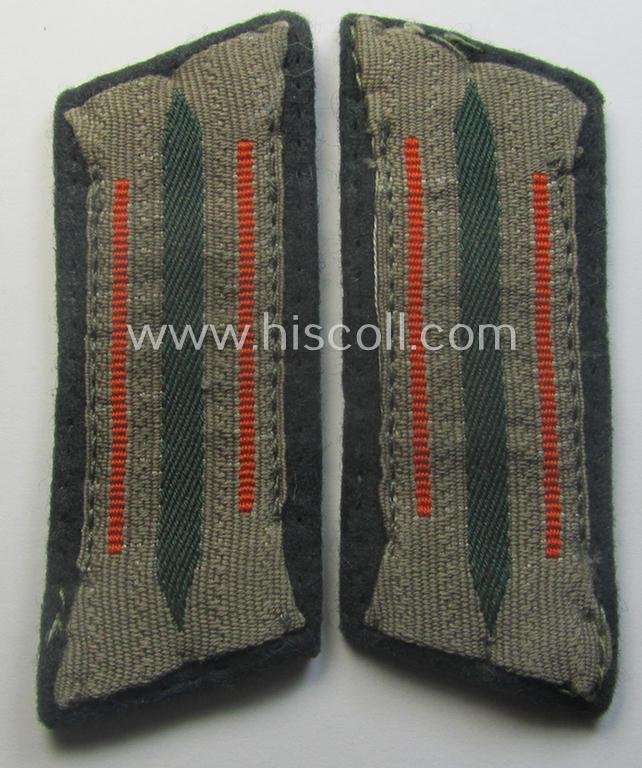 This is a very attractive - truly very hard to find and fully matching! - pair of (I deem) early-war period, WH (Heeres) 'M40'-pattern collar-patches (ie. 'Einheitskragenspiegel') as was piped in the neat bright-orange- (ie. 'orangeroter'-) coloured branchcolour as was specifically intended for usage by a: 'Soldat der Feldgendarmerie-Truppen' (or: soldier ie. NCO who served within an army, field-police staff-member) and that comes in an overall nice- (ie. clearly issued- and/or carefully tunic-removed-), condition. The tabs have the desirable bright-orange- (ie. 'orangeroter'-) coloured branchcolour signifying that they were intended for a soldier (ie. NCO) who served within an army field-police unit. Both tabs are nicely 'pre-mounted' (ie. machine-stitched) onto a darker-green-coloured- (and/or 'smooth'-woolen-based) background as more often seen (as can be seen on the pictures). The pair - which was once mounted onto a tunic - shows the typical, buckram-based backings (as can be seen on the pictures). Simply a great occasion to acquire a very attractive - and actually very scarcely encountered! - 'M40'-pattern collar-tab-pair that comes in a truly desirable branchcolour ie. 'Waffenfarbe'!