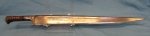 Original era manufacture. A well made short sword, or knife, from the Northwest Khyber regions.Well made all steel blade measuring nearly 22 inches in length, with a thin brass band at the base. T-back spine, with a thin fuller on each side, and decorative diagonal slashes at the base of the fullers.Carved wooden grips ending in a bird-head shaped pommel, with a thin steel protrusion at the pommel base. Minor damage/repair to the base of one of the wooden grips. Overall the weapon is quite sound, and exhibits a high degree or craftsmanship.