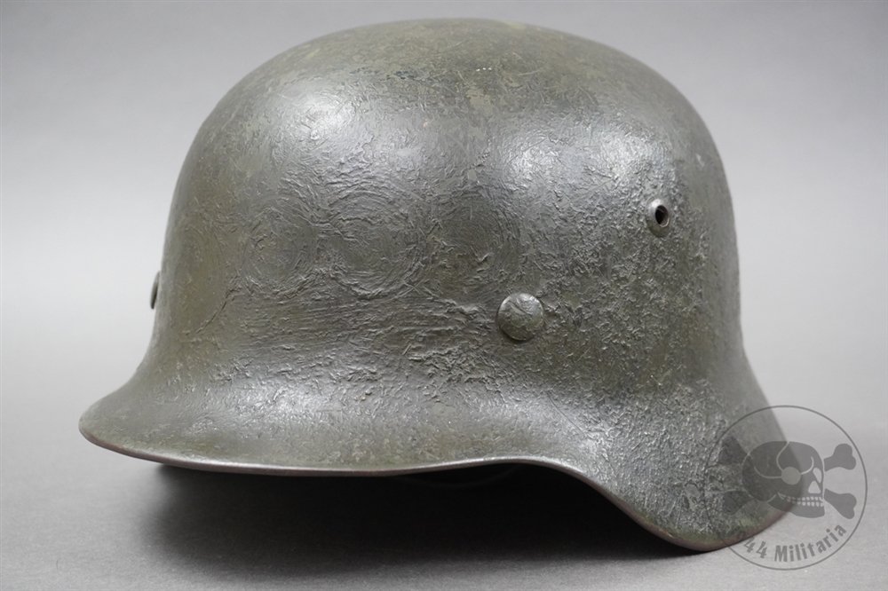 Original German WWII M35 Heer (Army) Ex-Double Decal Wood Chipped Camouflaged Helmet NS62This is an original German M35 steel helmet that was originally issued as a double-decal Heer (Army) model. As the war progressed and regulations changed, the decals were removed or painted over in accordance with regulations.The helmet features a period-applied wood chipped camouflage finish, a texture consisting of mixed paint and embedded wood shavings to break up the helmet's smooth finish.The helmet features a period-applied 'wood chipped' camouflage finish, consisting of dark fieldgray paint mixed with wood shavings to help break up the helmet's silhouette in combat. The camouflage shows excellent, age-appropriate wear and patina,particularly on the dome of the helmet, contributing to its authentic combat-used appearance.Stamped NS62, this helmet was manufactured by Vereinigte Deutsche Nikelwerke (NS) in size 62. The shell remains solid with no major dents or cracks.It retains its factory installedaluminum reinforced liner, dated1938and size54, complete with its well worn, supple leather that has taken on a rich, dark brown patina from use. The split pins are original to the helmet and, while slightly loose from wear, still retain their original washers.The helmet is also fitted with a pre-war chinstrap featuring aluminum hardware. The long strap is broken at the end, but most of it remains intact and appears original to the helmet.This is a highly collectible M35 Heer helmet in very good condition with period wood chipped camouflage, perfect for any serious WWII collection.