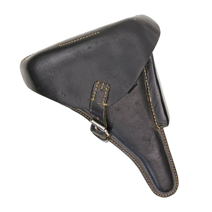 Excellent black leather hard shell P08 holster, stamped on the rear with maker and date cww 1942 and P.08, maker marked and dated, waffen proofed, thick black finished leather is in very good condition with only slight traces of use, closure strap and roller buckle are are without damage, no extra holes or cuts, take down tool fitting and pull strap are intact, has not been re-dyed, all stitching and components are sound, quality example, USD $325 WITHDRAWN